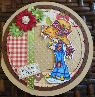I entered the Mojo Monday sketch challenge with my last card as the square sketch but was dying to try the circle sketch so here it is. I have used my new DP paper from October Afternoon - Farm Fresh Root Cellar and one of my Sarah Kay Stamps. I must admit I have been too scared to try colouring her images in with the Copics but thought I would bite the bullet and have a go. I have discovered the colourless blender and have found this opens the options up so much with the few colours that I have and the new card I have from Papertrey Ink is able to cope with the extra ink!! The sentiment is from Bizzy Becs Digital Store, check them out, they are so versatile!!